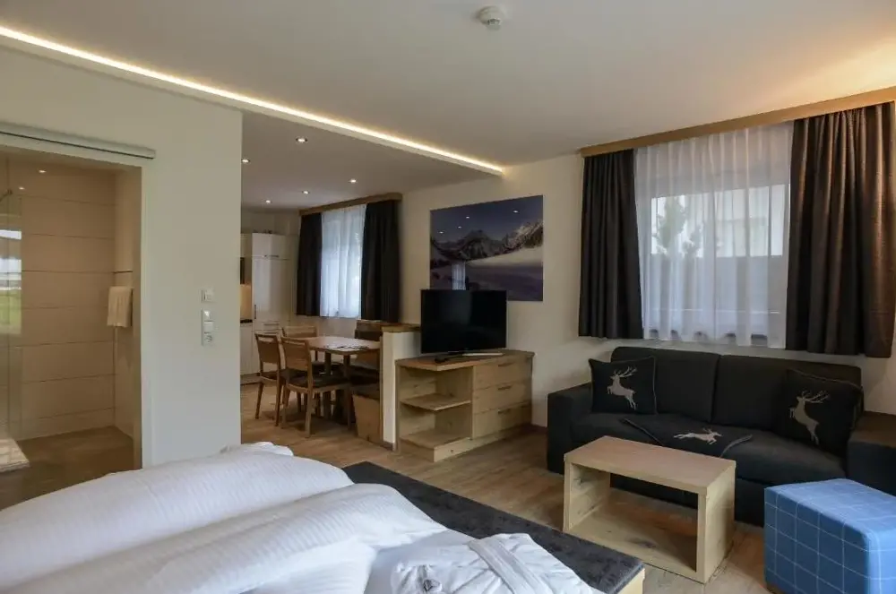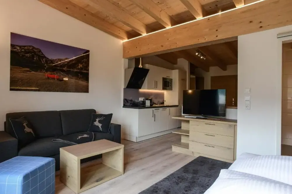 Die R Appartements Sommerbergbahnen inklusive befinden sich in ruhiger Lage am Ortsrand von Tannheim, Rossberg 23, und bieten eine moderne sowie geschmackvolle Unterkunft mit Fokus auf Gemütlichkeit und Funktionalität. Die Apartments sind mit viel Holz gestaltet und durchdacht ausgestattet, sodass sie alle Anforderungen für einen entspannten Aufenthalt erfüllen. Besonders hervorzuheben ist die integrierte Sauna, die nach ausgedehnten Wanderungen oder aktiven Tagen ideal zur Erholung dient. Ein weiterer Vorteil besteht in der kostenlosen Nutzung einer Gästekarte, welche den Zugang zu freien Fahrten mit den Sommerbergbahnen ermöglicht – praktisch für Ausflüge ins nahegelegene Skigebiet oder bei Spaziergängen durch die umliegende Natur. Die zentrale Position am Ortsrand sorgt dafür, dass man trotz der ruhigen Umgebung innerhalb weniger Gehminuten das Zentrum erreicht. In unmittelbarer Nähe liegen weitere Attraktionen wie die Vogelhornbahn (700 Meter entfernt) oder lokale Gastronomie wie die Tovino Bar (750 Meter). Auch Familien finden hier passende Zimmer vor, während barrierefreie Einrichtungen für Gäste mit eingeschränkter Mobilität verfügbar sind. Der kostenlose Parkplatz direkt vor Ort rundet das Angebot ab.